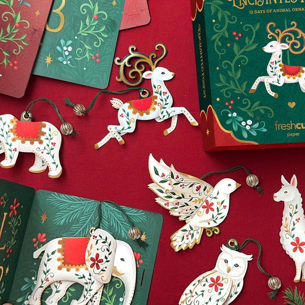 - 12 Festive Cards, each with a unique Woodland Animal Ornament inside.