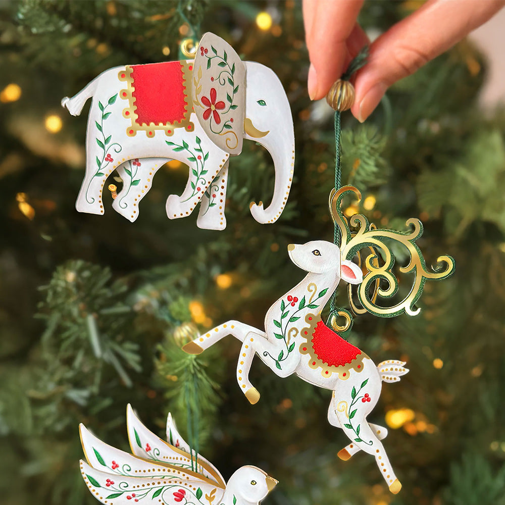 Twelve tiny treasures, each one more enchanting than the last. Beautifully illustrated, gold-foiled, and finished with vintage-style beads for hanging, this boxed set of woodland animal ornaments doubles as a delightful advent calendar. From a regal reindeer to a festive turtledove, these holiday ornaments bring a touch of magic to trees, mantels, gift toppers, and beyond. Whether used to count down the days until Christmas or simply to dress the season with a little extra wonder, this charming collection is a festive nod to classic holiday traditions. Measures 6.75" x 6" for boxed set, 5" x 5" for cards, and 4" x 4" for ornaments. We plant a tree for each product sold.