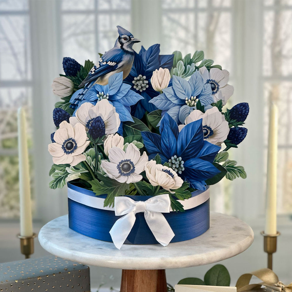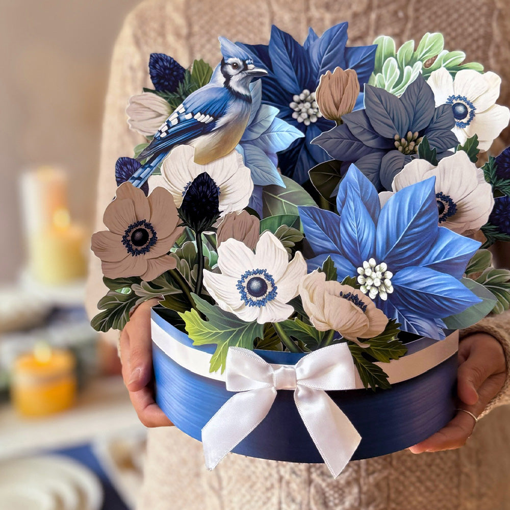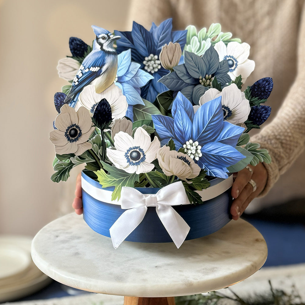 Vibrant blue poinsettias burst with life in this stunning wilt-proof bouquet. Blue thistles and dusty miller leaves add a touch of wild beauty, while snow-white anemones reflect the tranquility of winter’s early snow. A removable and life-like Blue Jay adorns the elegant arrangement, adding whimsy and chilly cheer to the refined curation of flowers. Blue Jays symbolize good fortune and protection, while poinsettias evoke goodwill and community spirit. A textured navy bowl with a satin bow and a customizable card makes the Blue Poinsettia a deluxe and heartfelt gesture. Measures approx 10” high by 11.5" across. 100% recyclable paper. We plant a tree for each product sold.