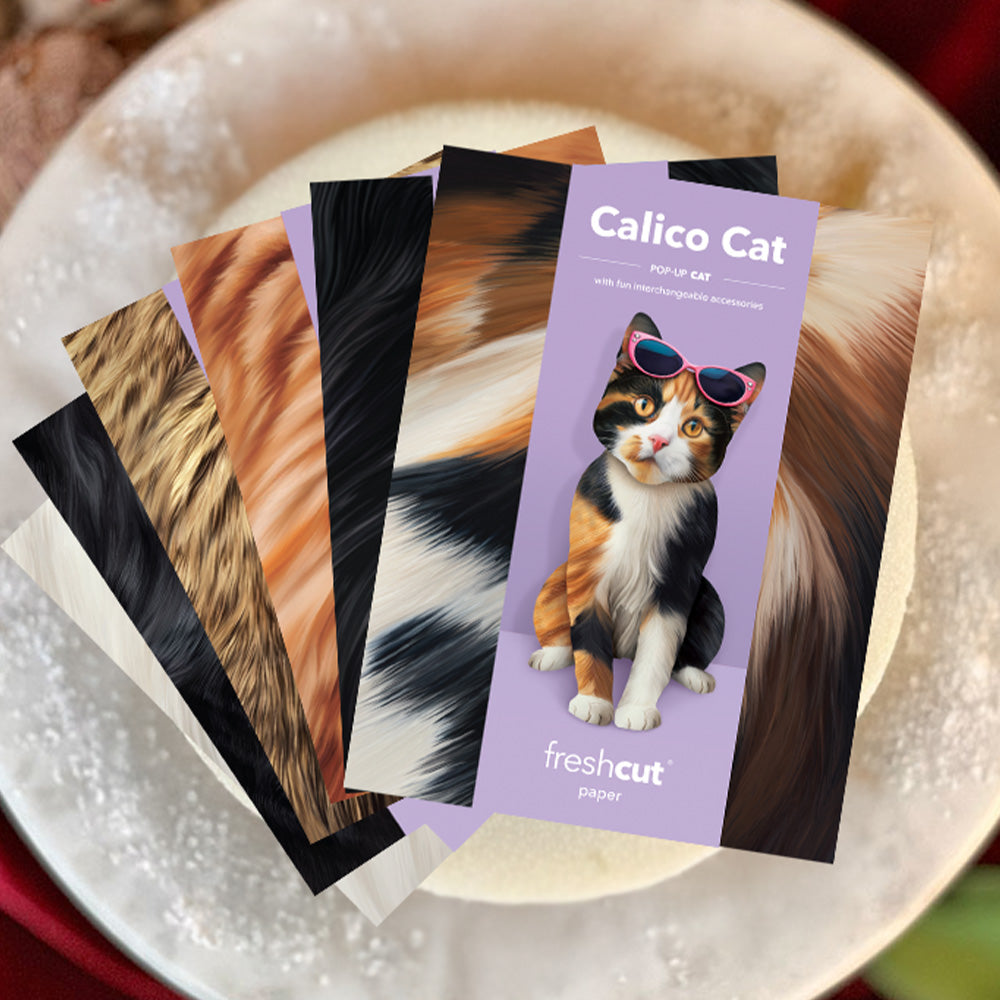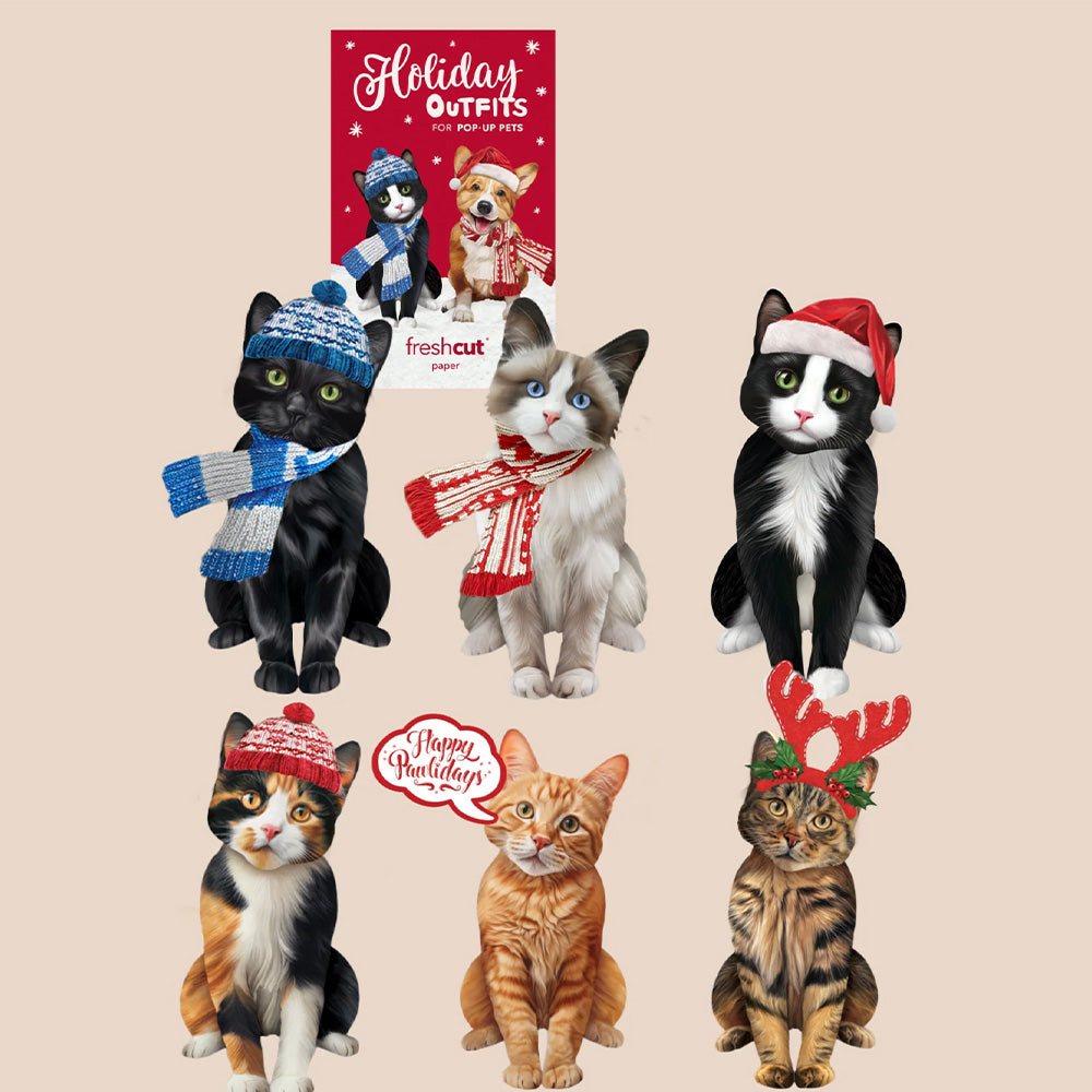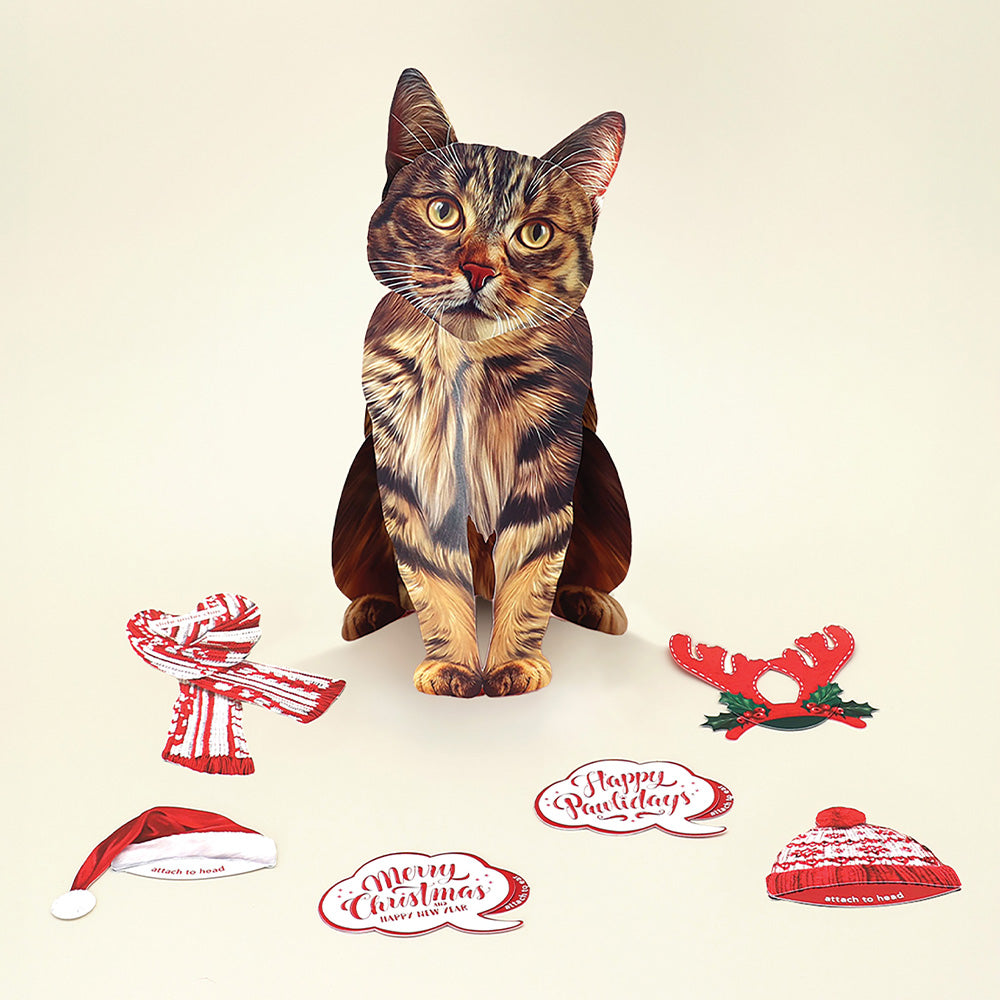 - Holiday Brown Tabby: Bring some festive joy to your holiday celebrations with FreshCut Paper’s Pop-Up Brown Tabby Cat! Each adorable pop-up cat features two selections of charming interchangeable accessories: one holiday-themed, the other for the everyday. You’ll also receive a beautifully decorated mailing envelope and a matching notecard. For an extra personal touch, you can add a customizable speech bubble, perfect for sharing cheerful messages with your loved ones. Measures 10" high by 5.5" across.