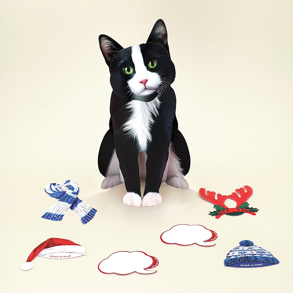 - Holiday Tuxedo Cat: Celebrate the holidays in style with our Holiday Pop-Up Tuxedo Cat! Each adorable pop-up cat features two selections of charming interchangeable accessories: one holiday-themed, the other for the everyday. You’ll also receive a beautifully decorated mailing envelope and a matching notecard. For an extra personal touch, you can add a customizable speech bubble, perfect for sharing cheerful messages with your loved ones. Measures 10" high by 5.5" across.