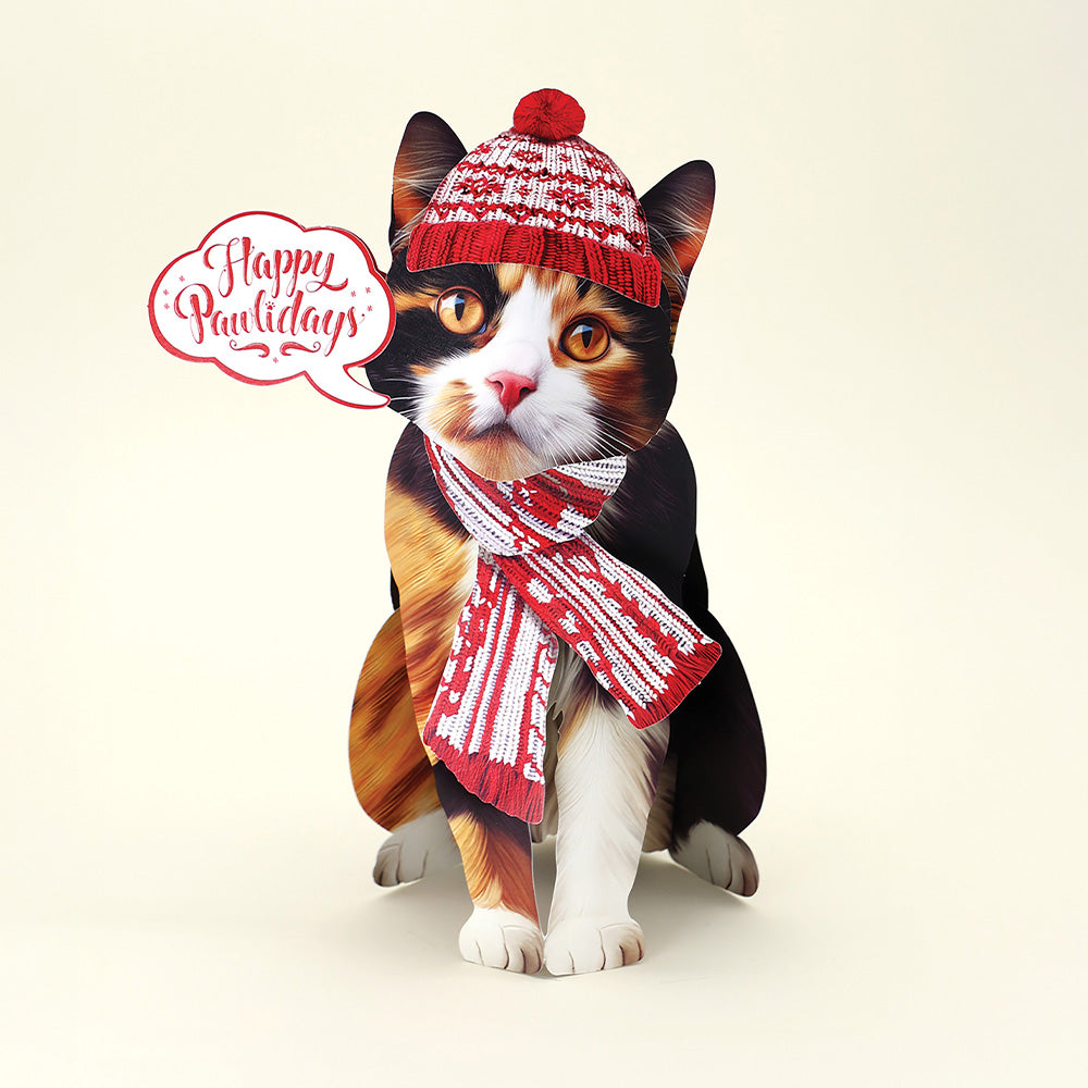 - Holiday Calico Cat: Bring some festive cheer to the season with a Holiday Pop-Up Calico Cat! Each adorable pop-up cat features two selections of charming interchangeable accessories: one holiday-themed, the other for the everyday. You’ll also receive a beautifully decorated mailing envelope and a matching notecard. For an extra personal touch, you can add a customizable speech bubble, perfect for sharing cheerful messages with your loved ones. Measures 10" high by 5.5" across.