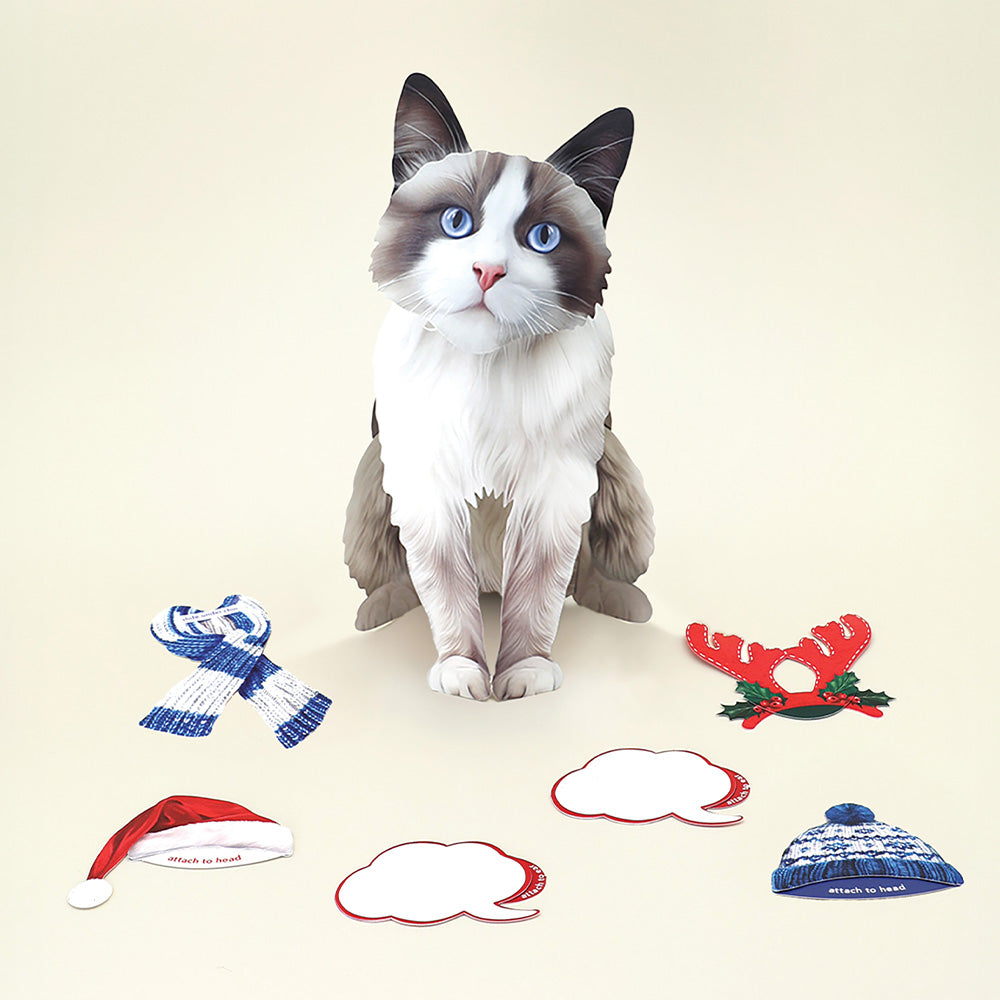- Holiday Ragdoll Cat: Celebrate the holiday season's most purr-fect moments—or just send a little laughter and joy—with a Holiday Pop-Up Ragdoll Cat. Each adorable pop-up cat features two selections of charming interchangeable accessories: one holiday-themed, the other for the everyday. You’ll also receive a beautifully decorated mailing envelope and a matching notecard. For an extra personal touch, you can add a customizable speech bubble, perfect for sharing cheerful messages with your loved ones. Measures 10" high by 5.5" across.