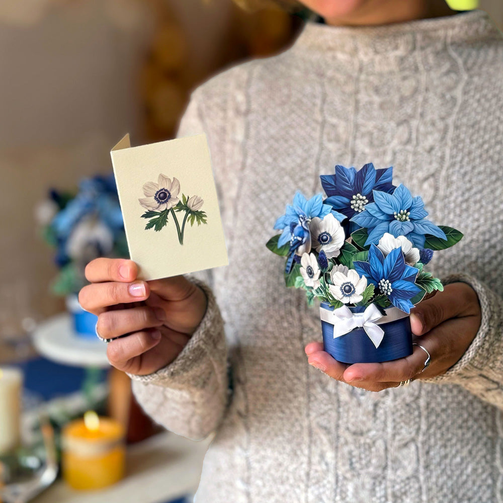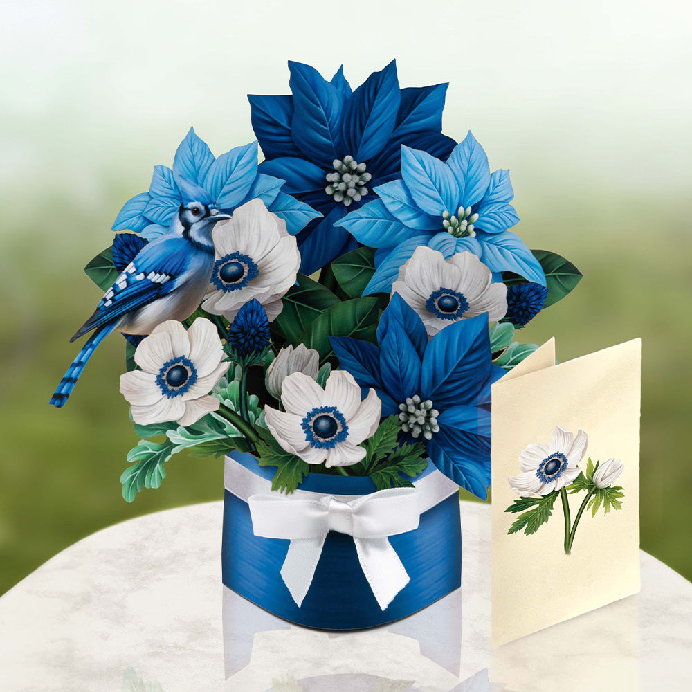 This festive expression of chilly cheer includes a cheeky Blue Jay, perched amongst subtle dusty miller leaves, bold blue thistle, and snow-white anemones. Blue Jays symbolize good fortune and protection while poinsettias evoke goodwill and community spirit, so spread the holiday cheer all around with a merry bouquet that will take you through the new year. Measures approx 5.5” high by 5" across. 100% recyclable paper. We plant a tree for each product sold.
