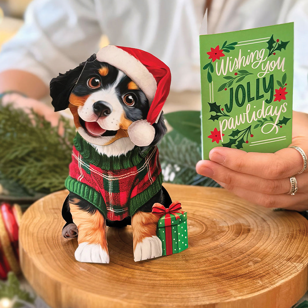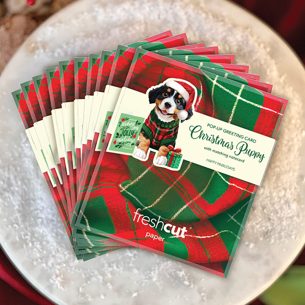 With a festive sweater, a Santa hat, and a gift wrapped just-so, the Mini Pop-Up Christmas Puppy is full of Christmastime cheer. It’s easy to tuck into a card and charming enough to earn a spot on the mantle all season long. This jolly little surprise is an adorable stocking stuffer for dog lovers of any age. Big holiday spirit in a petite package! Measures approx 5.5” high by 3" across. 100% recyclable paper. We plant a tree for each product sold.