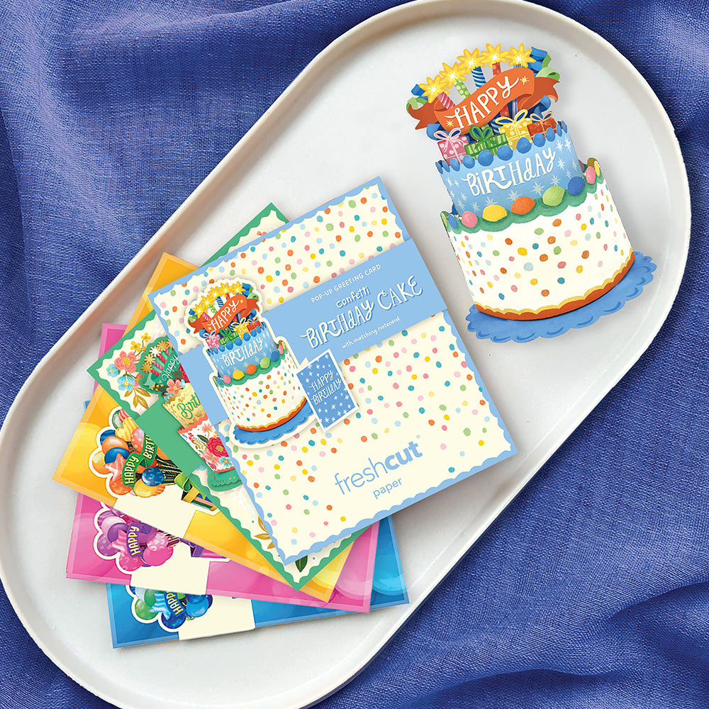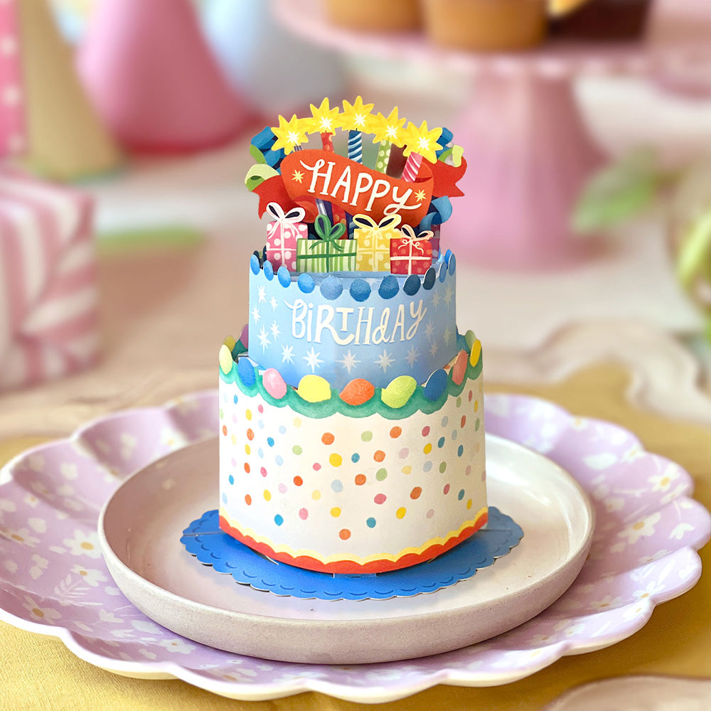 - Mini Confetti Birthday Cake: The best way to say happy birthday? The Mini Confetti Cake! Small in size but big on fun, this two-tiered pop-up brings a rainbow of cheer in a playful, compact package. Let the confetti fly and the celebration begin with the birthday card that makes a memorable impression on their big day. Measures approx 6” high by 4.5" across.