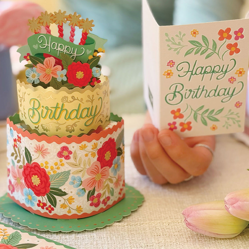 - Mini Blooming Birthday Cake: Make their special day even sweeter with our Mini Blooming Birthday Cake Pop-Up Card. Our pop-up two-tiered cake, adorned with gold foil and delicate florals, is a one-of-a-kind way to send birthday cheer. Watch as it pops up into a sparkling display that’s sure to make their day. Measures approx 6” high by 4.5" across.