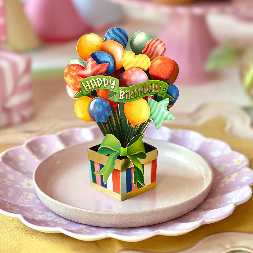 - Mini Birthday Balloons: This isn’t just a birthday card—it’s a mini celebration in itself! The Mini Multi-Colored Balloon Pop-Up Card unfolds to reveal a playful array of balloons in every hue, highlighted with shimmering gold-foil accents. The perfect card for birthdays that deserve a little extra sparkle. Measures approx 6” high by 4" across.
