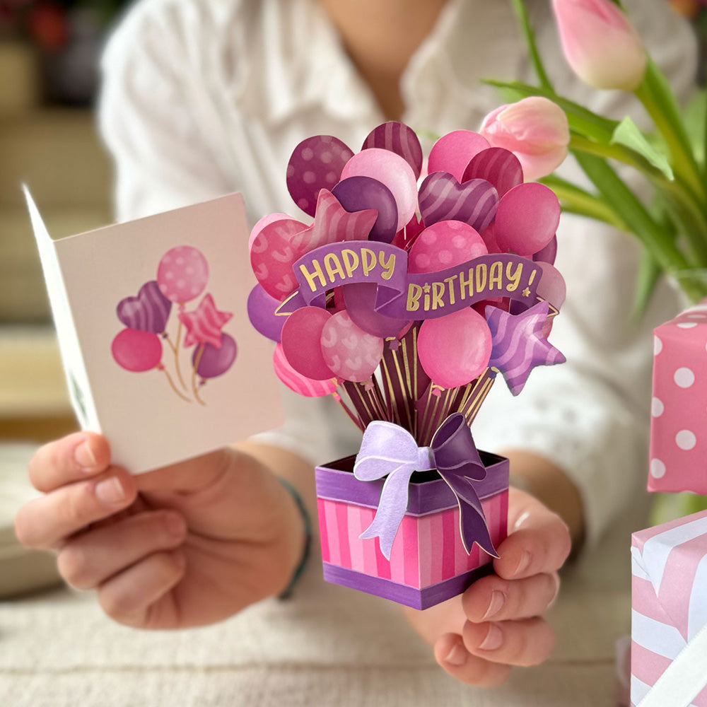 - Mini Pink Birthday Balloons: Want to make their birthday pop? Our Mini Pink Birthday Balloons pop-up card bursts with soft pinks, accented by a glimmer of gold foil. It opens to reveal a playful parade of pink balloons, the perfect way to celebrate any birthday, no matter how old they are. Measures approx 6” high by 4" across.