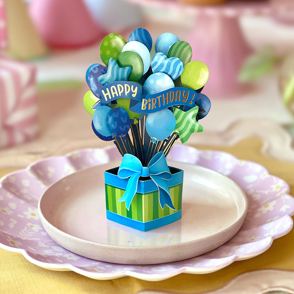 - Mini Blue Birthday Balloons: A little card, a lot of birthday cheer. Our Mini Blue Birthday Balloons Pop-Up Card shimmers with gold-foil details and opens to reveal a cascade of brilliant blue and glorious green balloons — the perfect way to mark the occasion, no matter how many candles are on the cake. Measures approx 6” high by 4" across.