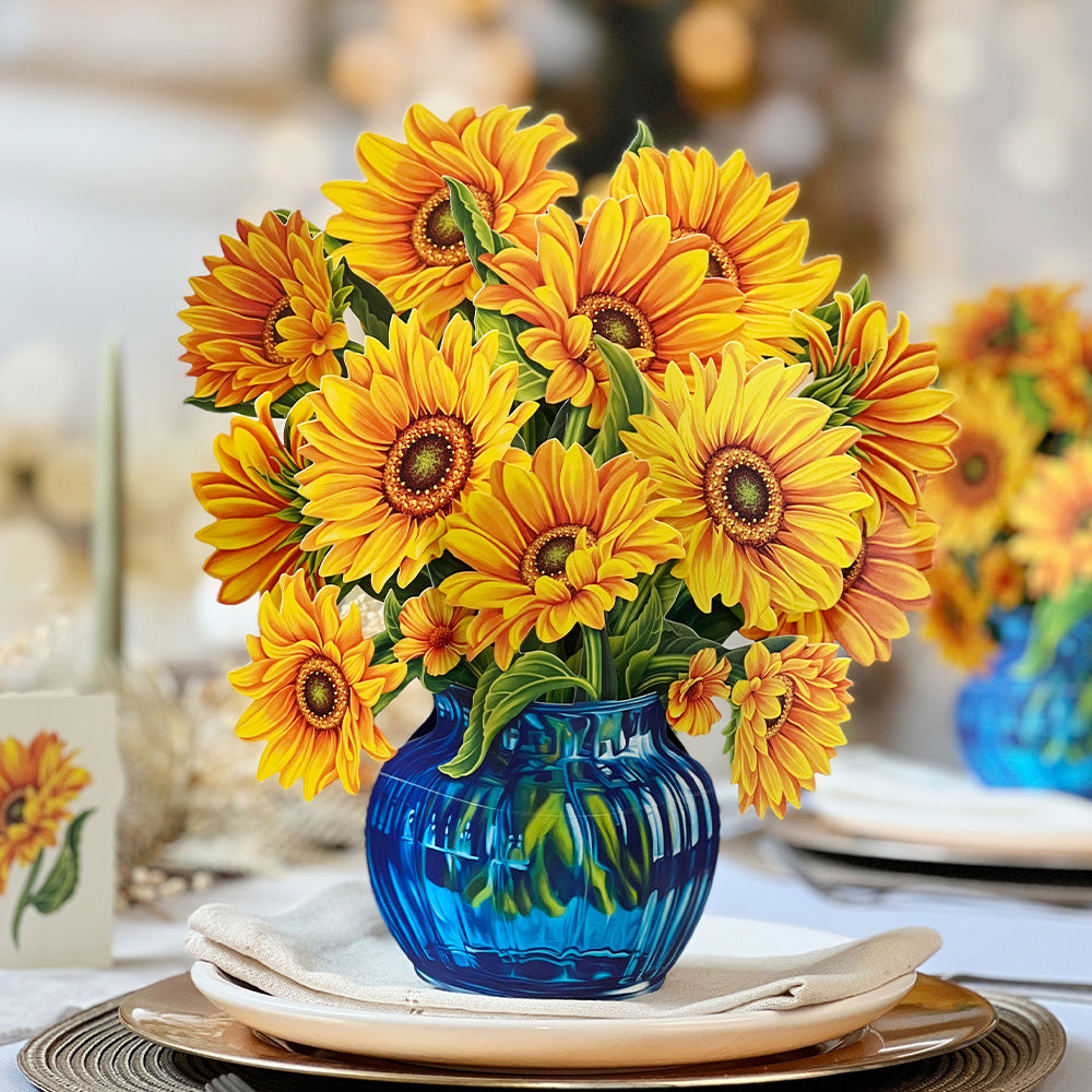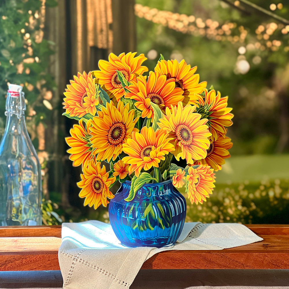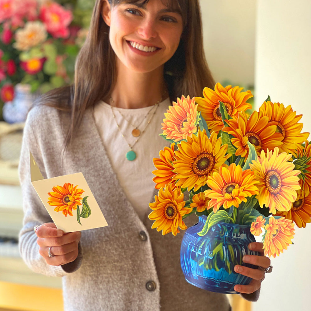 FreshCut Paper's cheerful Sunflowers are a warm and inviting reminder of the sweet summer sun’s energy and life force. Our 3D pop up Sunflowers, inspired by Vincent Van Gogh, feature an elevated design that will lift spirits and add a cheery splash of color that will never wilt. Measures approx 12” high by 9" across. 100% recyclable paper. We plant a tree for each product sold.
