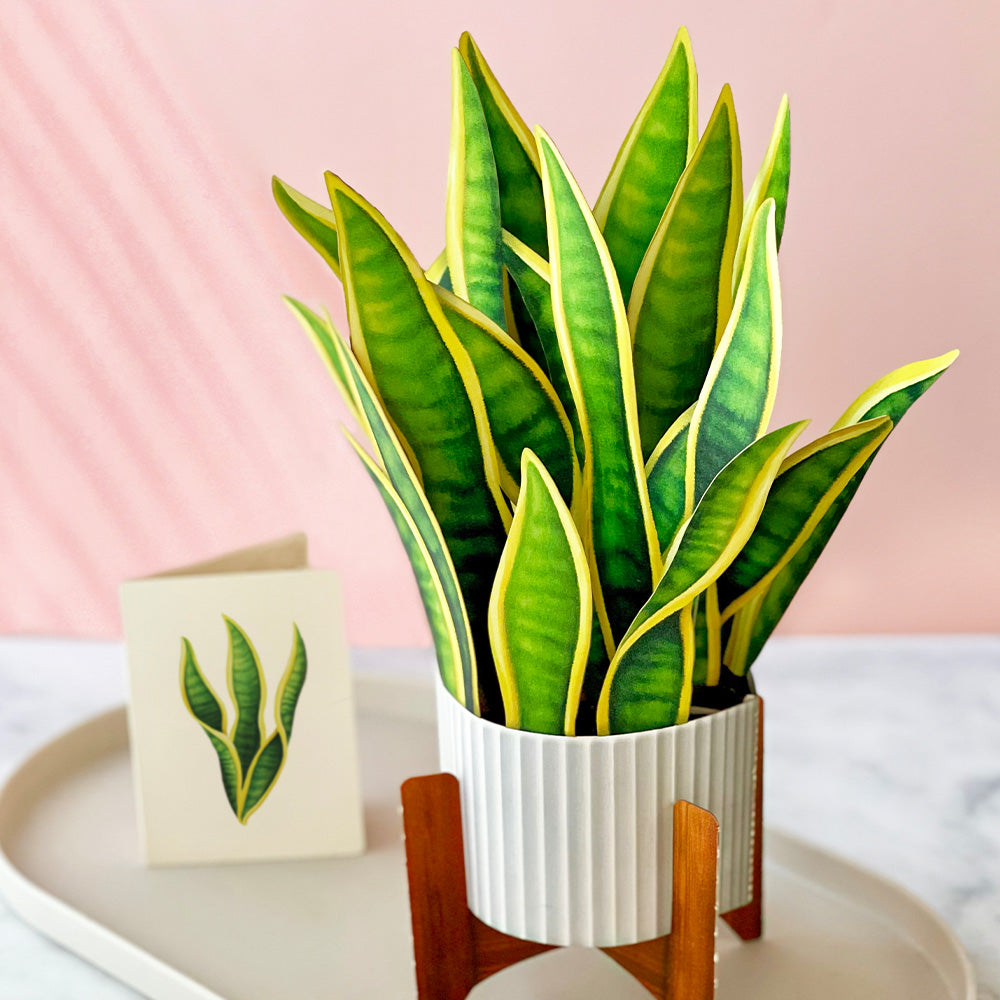 Characterized by its tall sword shaped leaves with yellow edges, the Snake Plant or Sansevieria, is a tropical treasure and houseplant staple! Paired with a modern white planter and mahogany wood stand, this stunning display is perfect for any occasion. Measures 13.5" high by 9" across.